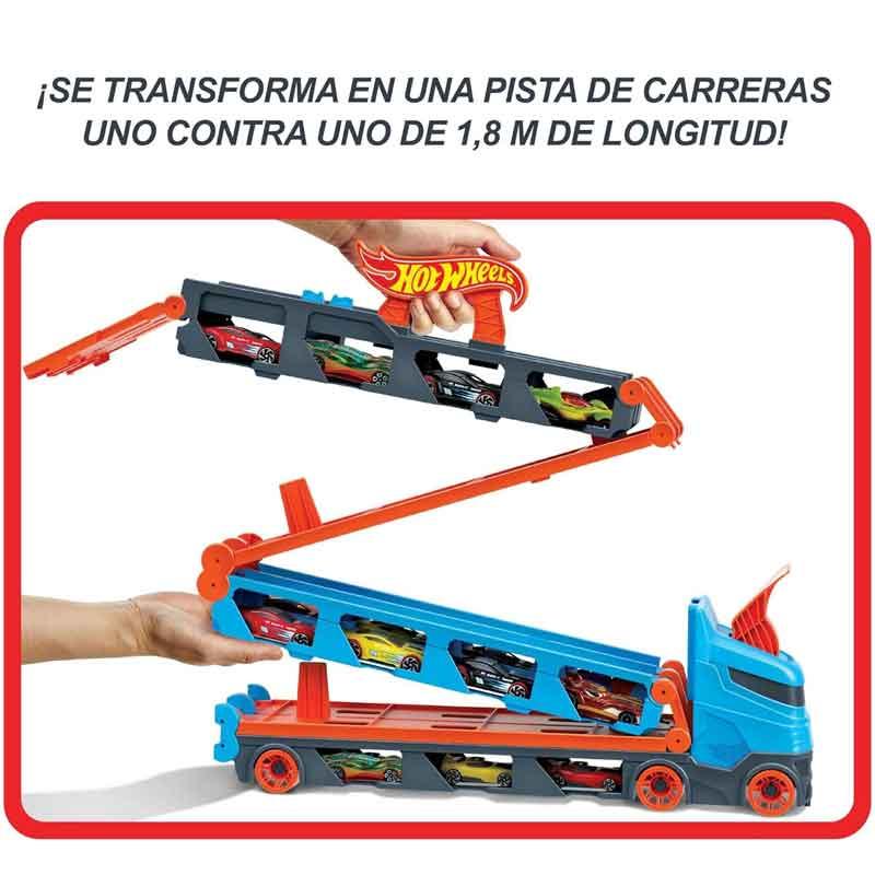 Incluye 1 camión de transporte, lanzador doble, 3 coches de Hot Wheels a escala 1:64, pista de 182cm, desvíos y puntos de conexión.