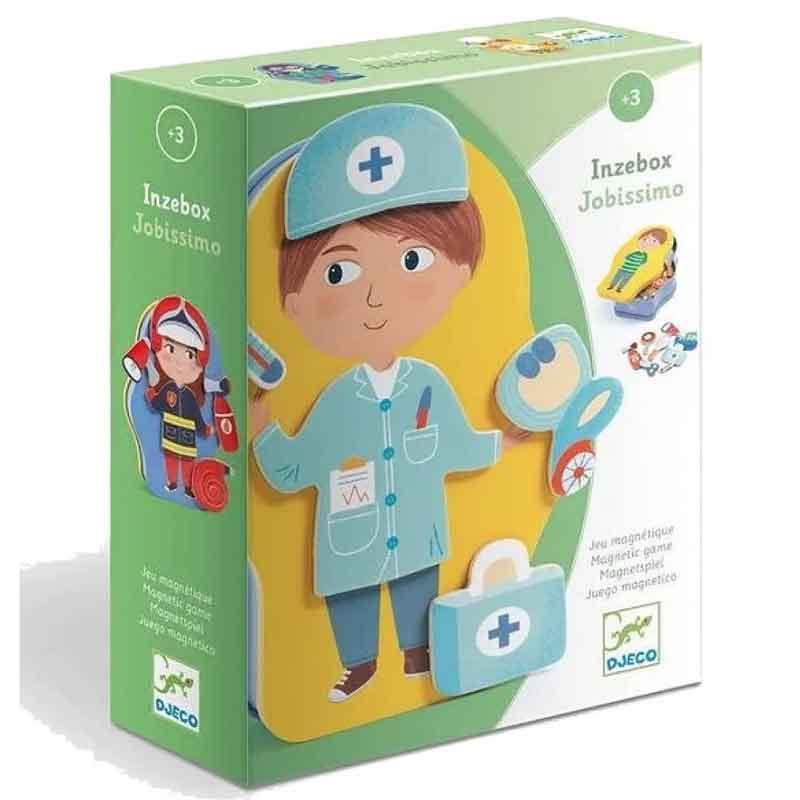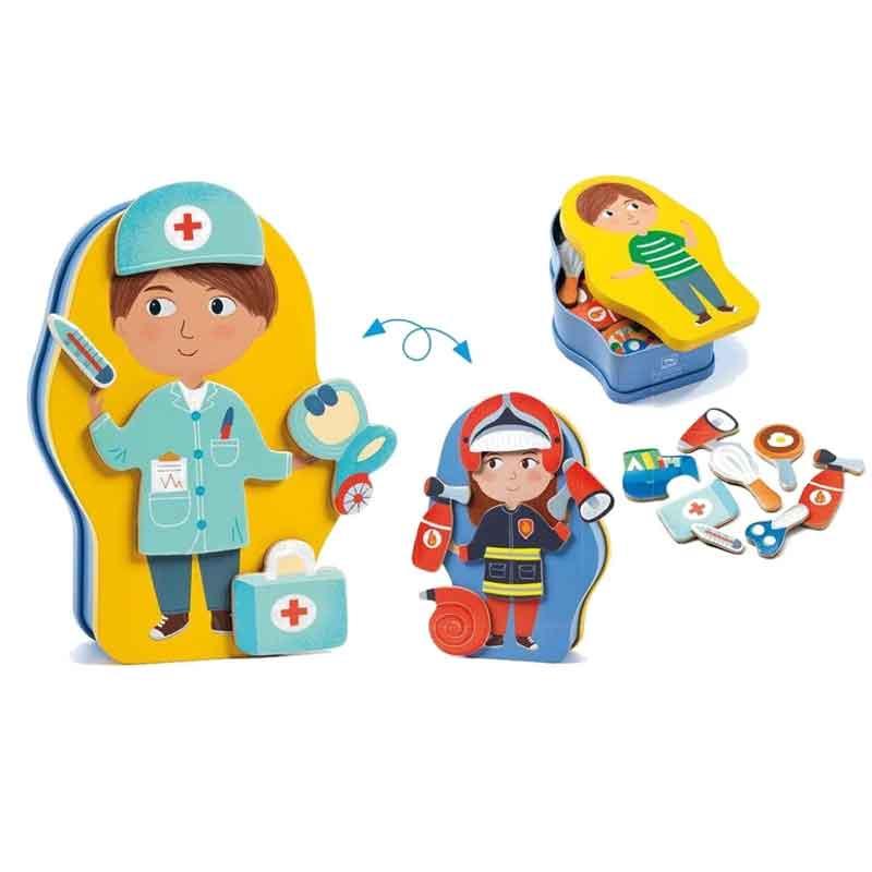 El juego mágnetico Jobisssimo de djeco contiene 20 piezas de madera con imanes, una caja de metal en la que los más peques podrán crear distintas combinaciones de personajes con distintos oficios,
