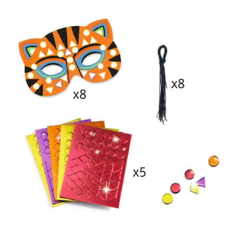 El set incluye 8 máscaras de animales para decorar, 8 gomas elásticas, 5 tableros con piezas de mosaico adhesivas de colores metalizados y una guía de instrucciones de uso.
