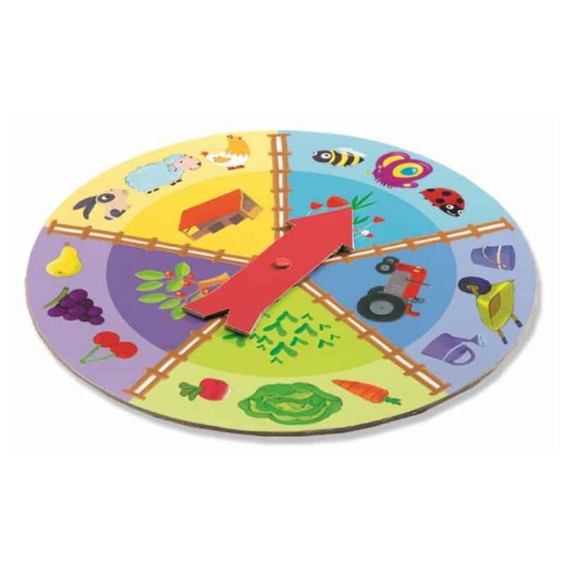 Basta hacer girar la flecha y ésta indicará un tema (frutas, legumbres, animales de la granja, insectos, herramientas de la granja), e introduciendo la mano en la bolsa, el jugador deberá encontrar la figura que pertenece a la categoría indicada.