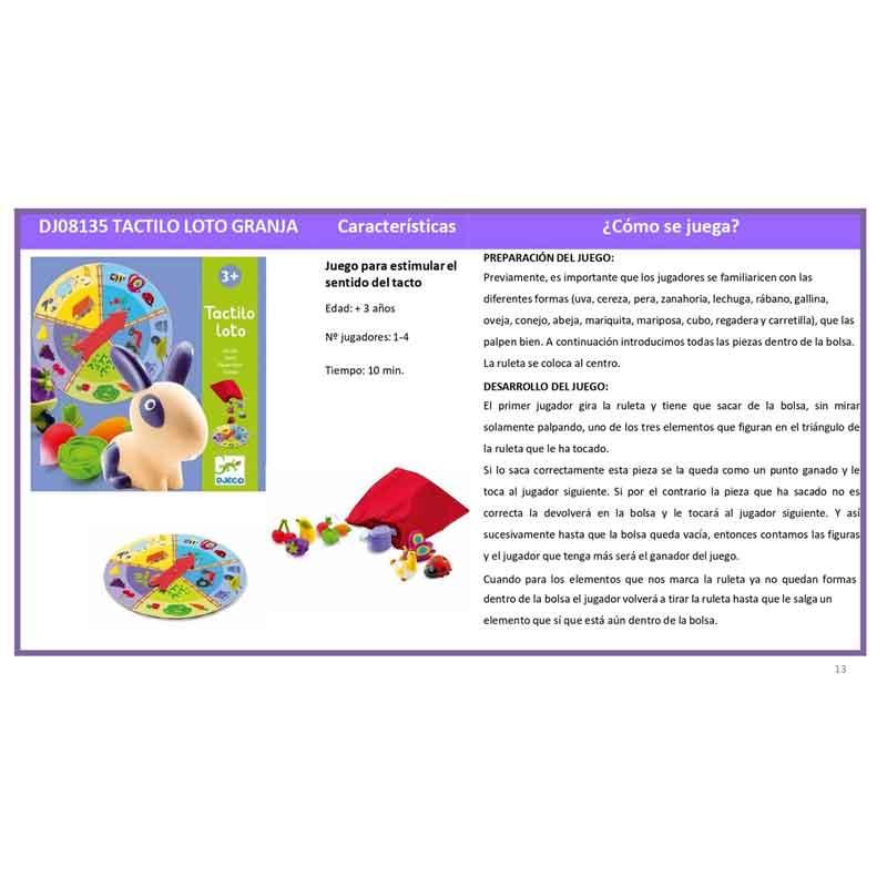Incluye: una ruleta de cartón de 21 cm de diámetro, 15 figuras de plástico blando (conejo, cordero, pollito, abeja, mariquita, mariposa, cubo, carretilla, regadora, lechuga, rábano, zanahoria, uvas, pera, cereza) y una bolsa.