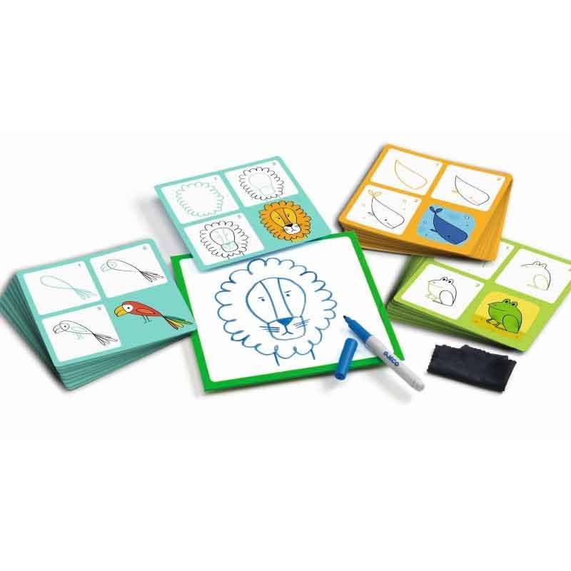 Con este juego, podrás practicar en la pizarra borrable cómo dibujar cada animal, guiándote por las tarjetas y siguiendo los pasos; primero dibujarás los trazos principales y después el resto de detalles, ¡es muy fácil!