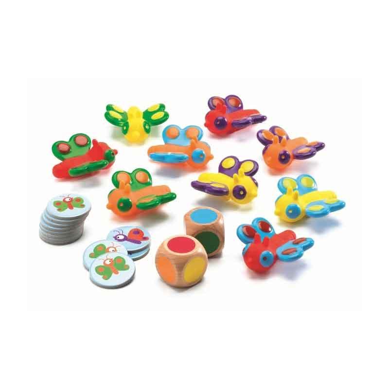 Incluye: 9 mariposas. 2 dados de colores. 30 fichas e Instrucciones.