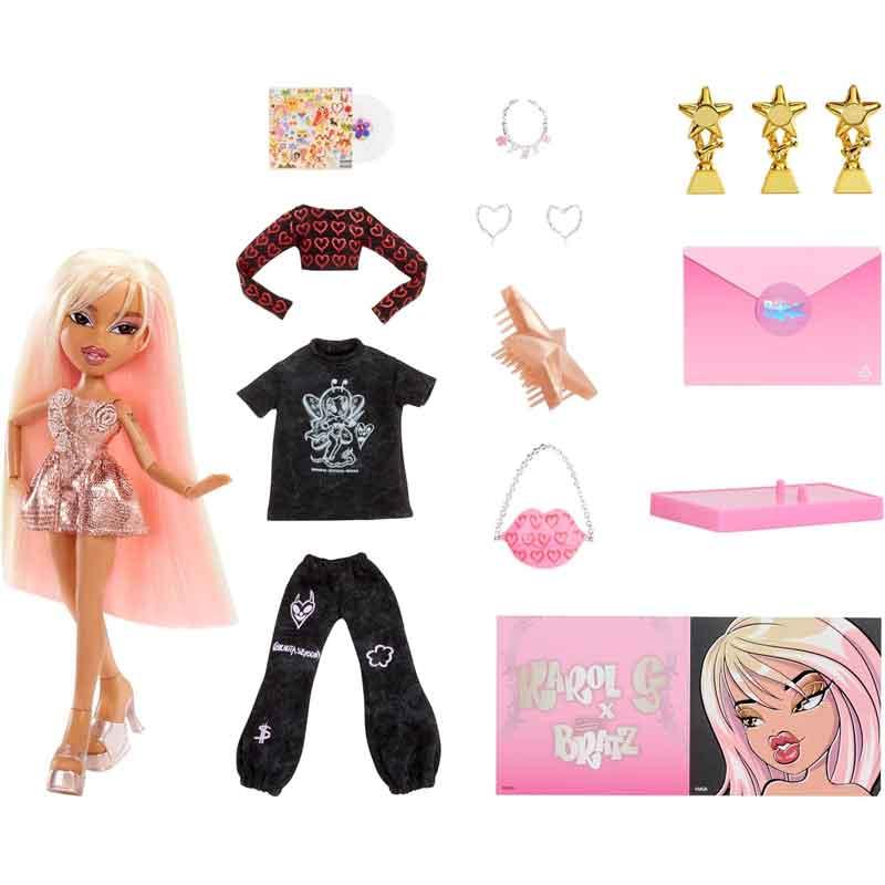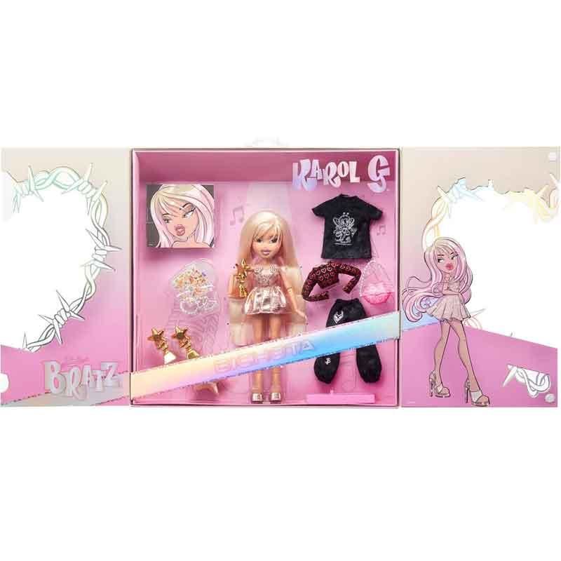 ¡Dos íconos de la cultura pop se unen! Karol G, la superestrella colombiana, llega al mundo de Bratz con su distintivo cabello platino y rosa, flequillo moderno y maquillaje suave, convirtiéndola en una Bratz única y especial.