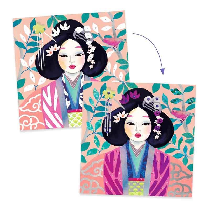 Esta caja ofrece 4 retratos de mujeres fuertes y elegantes para embellecer con una técnica de collage fácil y mágica.