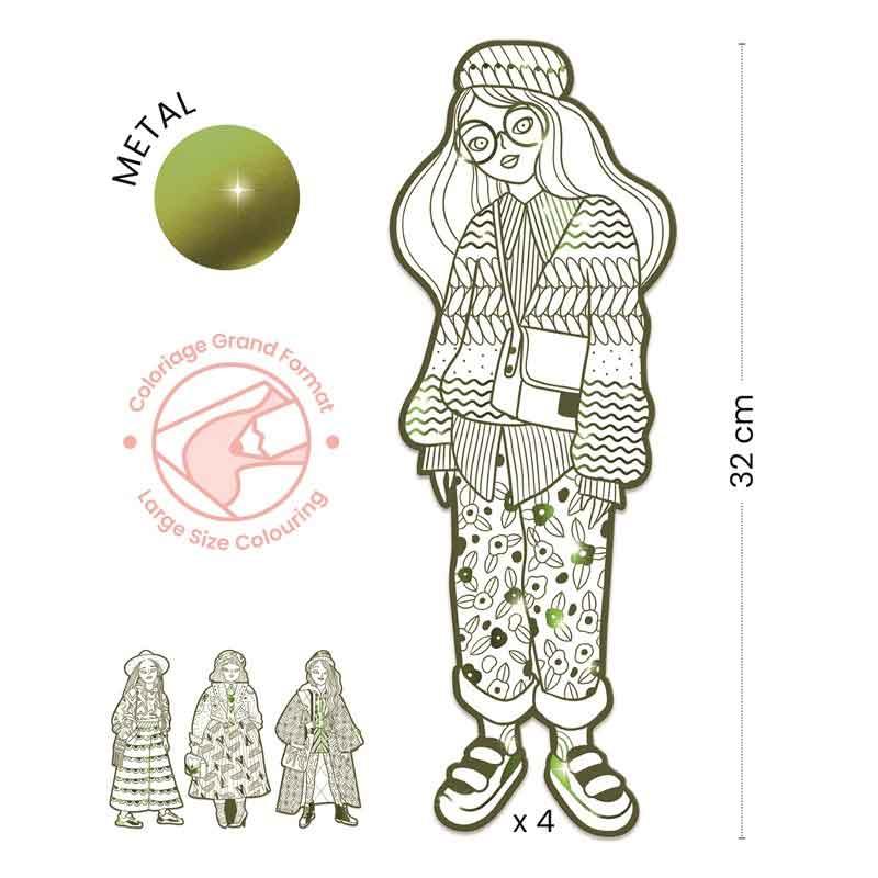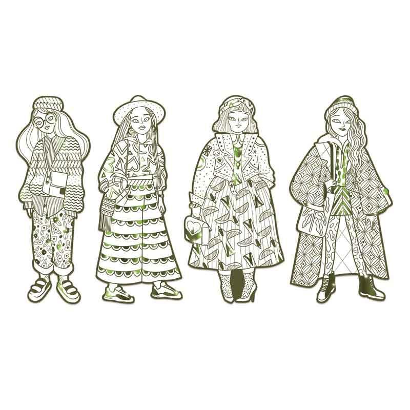 Cada ficha es una figura de una mujer de 32 cm de alto con diferentes diseños de moda para colorear.