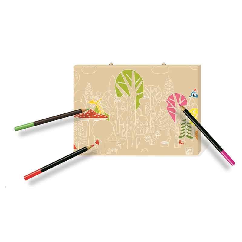 Para empezar, su bonita caja de cartón duro, decorada con animales y árboles del bosque, ¡espera a ser decorada!