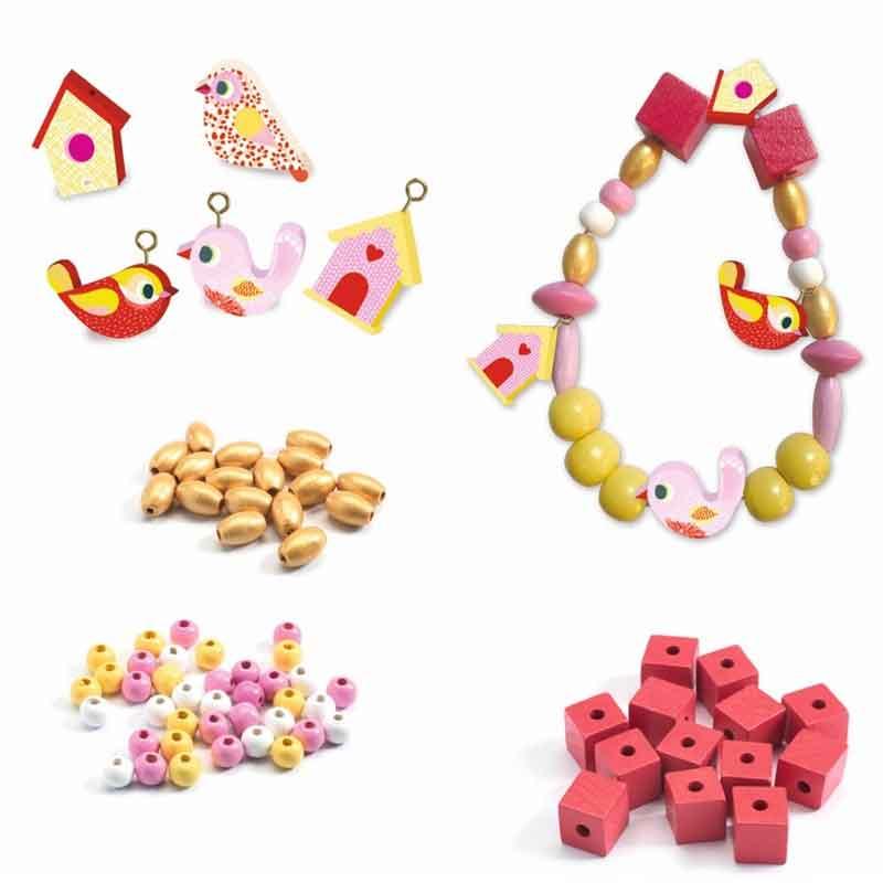 Divertida manualidad creativa para realizar pulseras y collares con perlas y bolas de madera inspiradas en los pájaros.