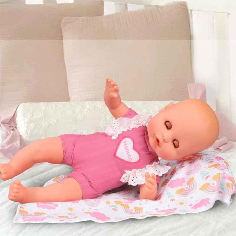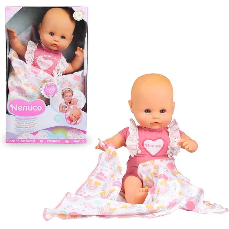 Incluye: 1 muñeca bebé Nenuco con sonidos realistas de bebé, ojos azules con párpados que se cierran, conjunto de color rosa con corazón de Nenuco y 1 mantita de color blanca con estampado especial a todo color.
