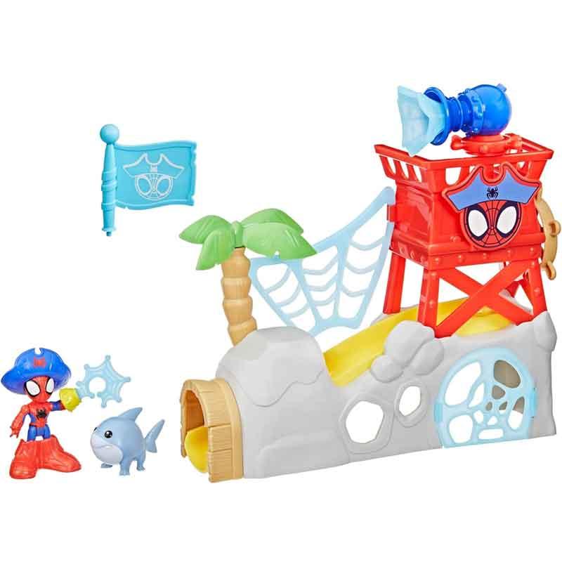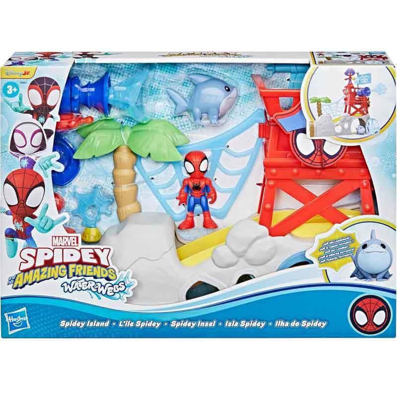 Incluye: 1 figura articulada Spidey , 1 figura tiburón Jeff y 1 playset Isla Spidey con lanza redes, trampa, tobogán, palmera y más detalles geniales.