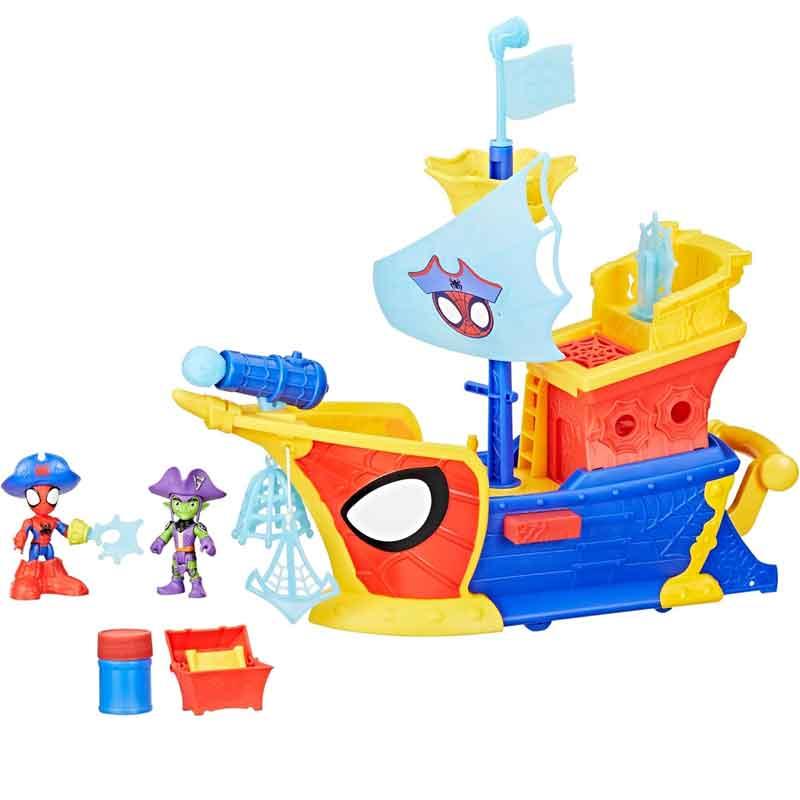 INCLUYE 2 FIGURAS MARVEL Y ACCESORIOS: El Barco pirata con telarañas y burbujas incluye una figura de Spidey y una del Duende Verde de 7,6 cm, 2 sombreros de pirata y 1 par de botas, todos estos accesorios inspirados en los episodios de la serie Spidey y su superequipo que transmite Disney Jr.