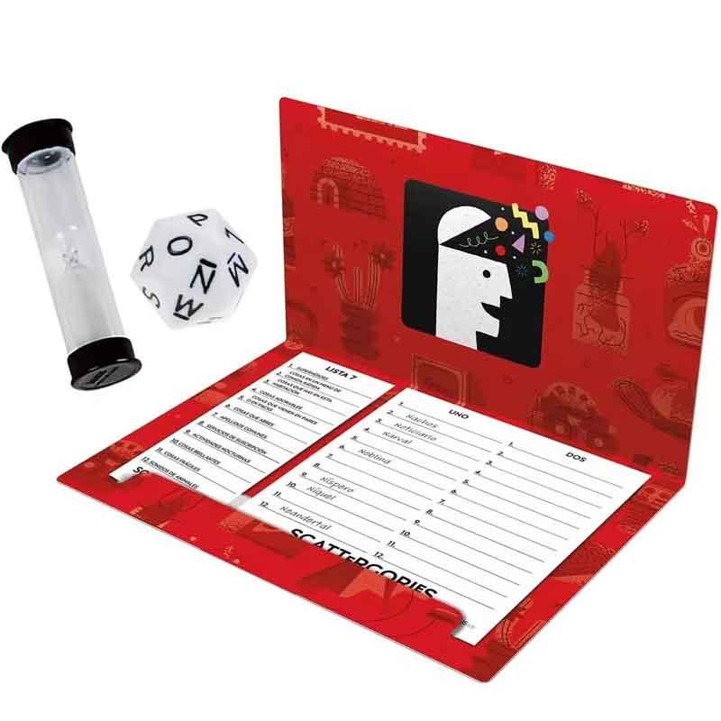 Incluye 6 carpetas, bloc de hojas de respuestas, dado de 20 caras, 48 tarjetas de categorías, reloj de arena e instrucciones.