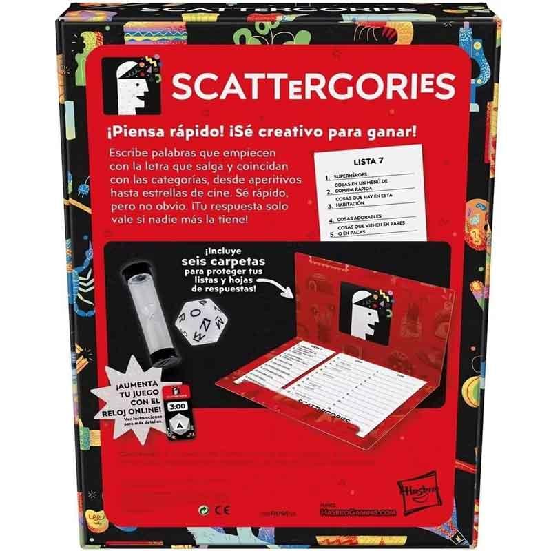¡Con Scattergories, el juego de categorías y palabras, tendrás que pensar con rapidez! Lanza el dado, dale la vuelta al reloj de arena y piensa en posibles respuestas para cada categoría de la lista de categorías.
