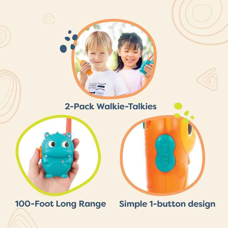 Desde secretos divertidos hasta el escondite, ¡solo presiona un botón y habla! Los walkie-talkies Hippo & Monkey de B. Toys son ligeros, portátiles y muy fáciles de usar.