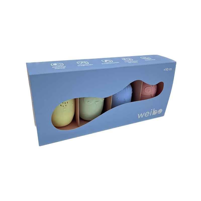 Cuatro divertidos animalitos fabricados en silicona alimentaria y pensados para divertirse a la hora del baño.