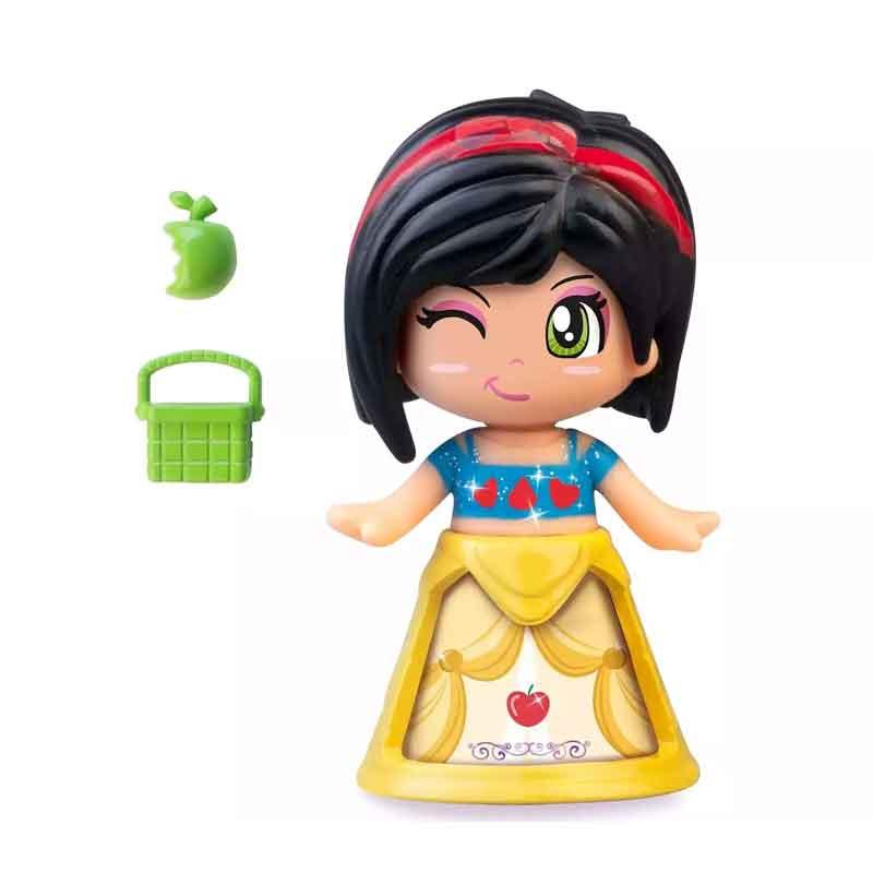 Incluye: 1 muñeca Blancanieves de Pinypon Tales con falda amarilla giratoria que muestra varios estampados, camiseta azul con purpurina y muchos más detalles geniales, 1 manzana verde ara la muñeca y 1 cesta verde para la muñeca.