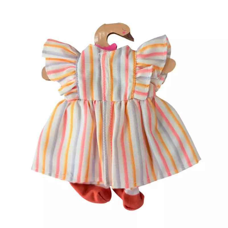 Incluye: 1 vestido de rayas blancas, azules, rosas y naranjas, 1 patucos rosas y blancos y 1 percha de cisne con lacito rosa.