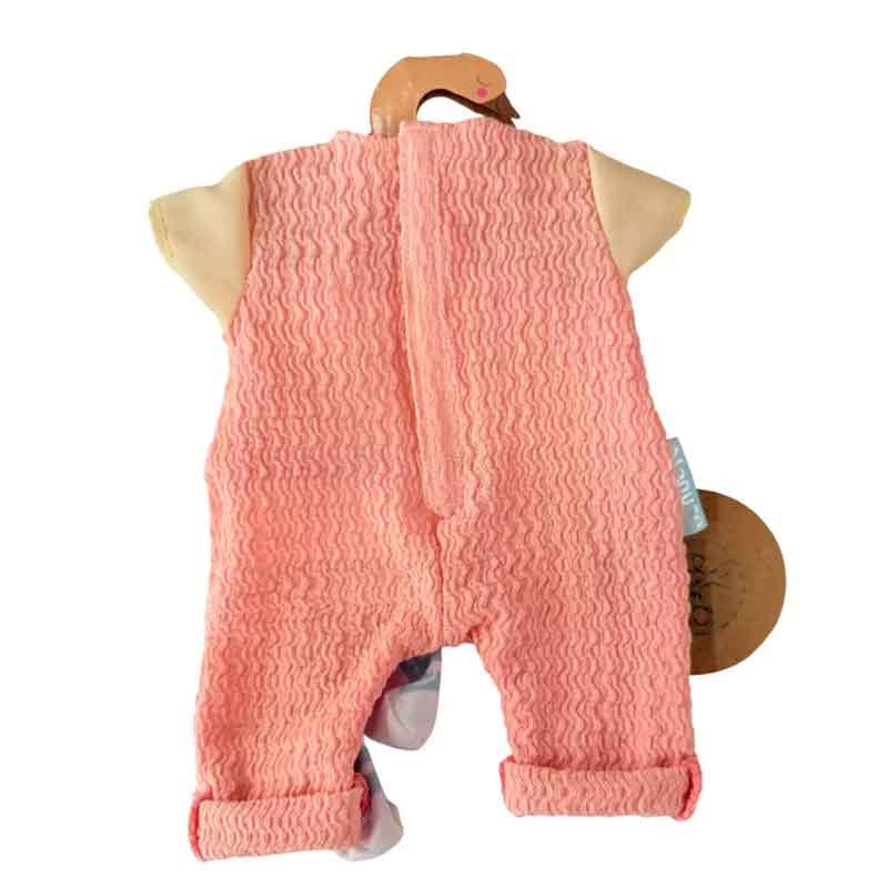 Incluye: 1 peto de color rosa con camiseta de manga corta en color beige y dos tirantes, 1 patucos de color blanco y azul y 1 percha de color marrón con forma de cisne con lacito de color rosa.