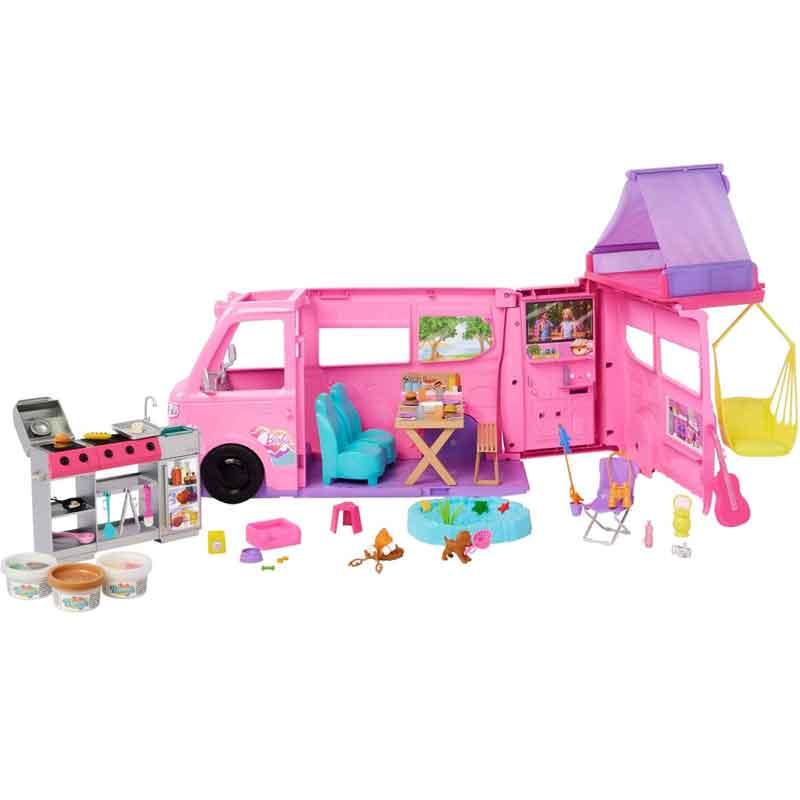 Disfruta del aire libre con el conjunto de juego Súper Caravana DreamCamper de Barbie, que cuenta con 7 zonas de juego y más de 60 accesorios, incluido un cachorrito, ¡para imaginar un sinfín de historias de acampada!