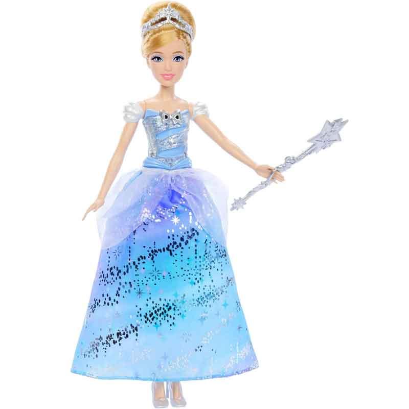 ¡La muñeca Cenicienta con vestido de baile encantado rememora el inolvidable momento de la película de Disney en el que un movimiento de varita mágica transforma el vestido de Cenicienta en un remolino de destellos!