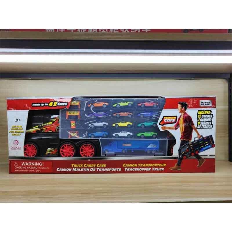 Fantástico camión trailer en formato maletín que incluye 12 coches diferentes.