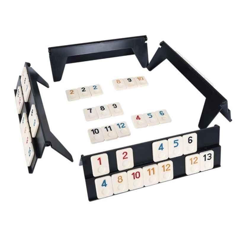 Contiene 106 fichas (8 conjuntos de fichas numeradas del 1-13 en 4 colores y 2 comodines), 4 soportes