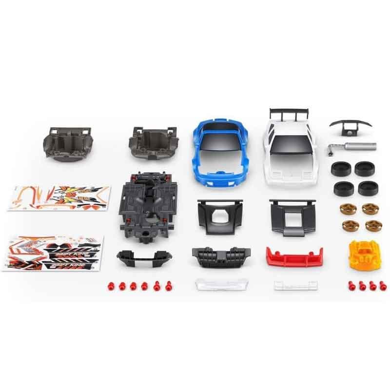 Incluye: 1 casco Metal Machines Speed Heroes con 2 carrocerías de coche sorpresa, 1 chasis, 1 capos del motor, 2 faros delanteros, 2 motores interiores, 2 parachoques delanteros, 1 parachoques trasero, 4 ruedas, 4 neumáticos, 1 destornillador, 6 tornillos largos, 3 tornillos cortos, 1 motor con luz y sonidos, 2 pegatinas, 1 slime e instrucciones en varios idiomas.