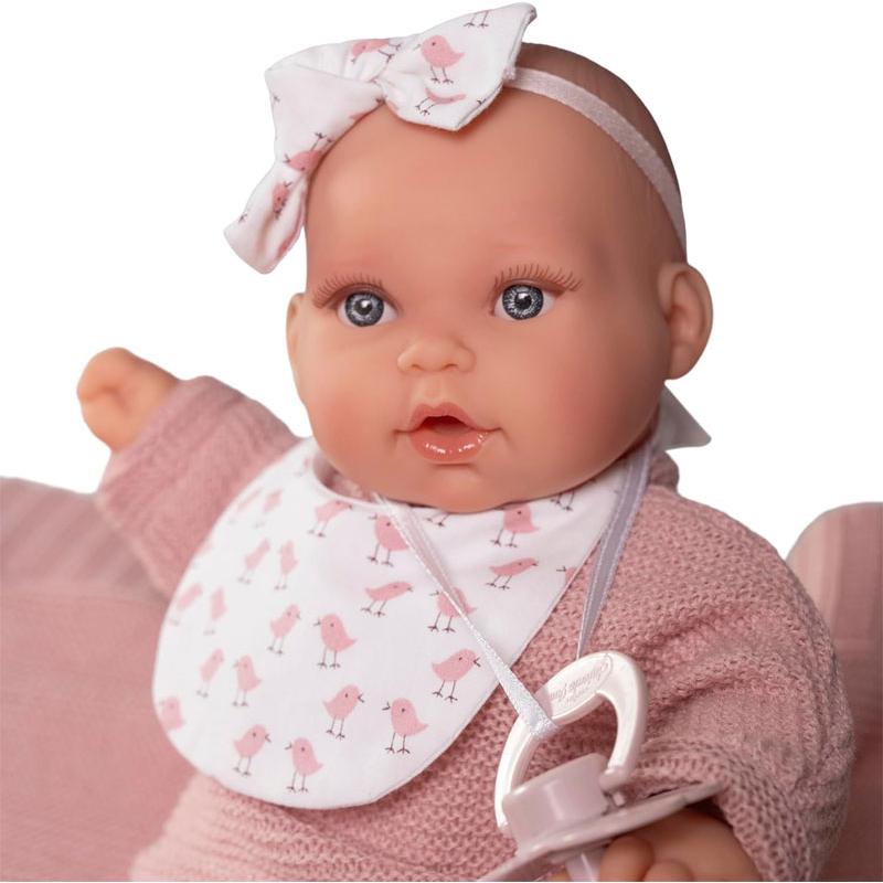 Lleva un culotte a juego con su diadema y babero, si le quitas el chupete, llorará llamando a sus papás… ¡pero con él, se calmará enseguida! Esta muñeca mide 27 cm, perfecta para abrazarla y llevarla a todas partes.
