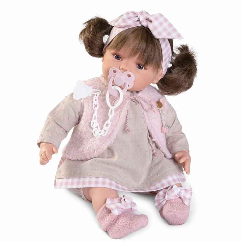 Beni es una muñeca con mecanismo de sonido de Muñecas Antonio Juan. Al quitarle el chupete llora y llama a sus papás, pero si le pones el chupete se tranquilizará.