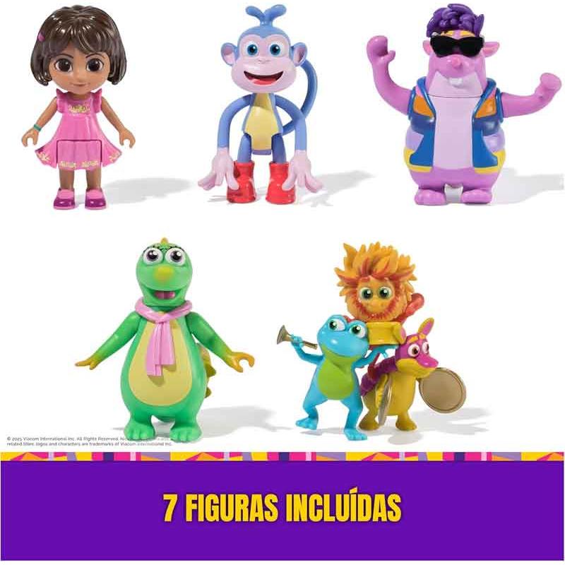Este pack incluye cinco figuras: Dora, Botas, Tico, Isa y el divertido Trío Fiesta, todos con diseño fiel al original y extremidades articuladas para jugar sin límites.