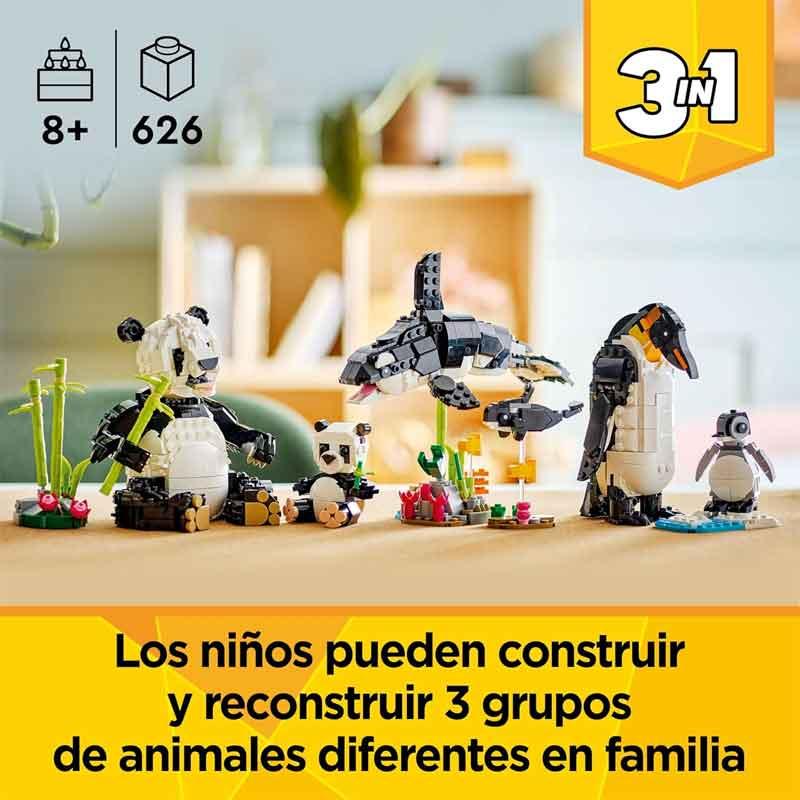 Los niños pueden construir cualquiera de 3 juegos LEGO de animales con los mismos ladrillos: una figura articulada de un panda con su cachorro al lado de tallos de bambú; una figura articulad a de una orca con su cría, que pueden exponerse juntas en bases transparentes; o un pingüino de juguete articulado con su polluelo en una zona de hielo y agua.