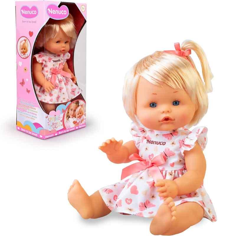 Nenuco luce un encantador vestido decorado con mariposas, combinado perfectamente con un lacito en el pelo que resalta su estilo alegre y fresco.