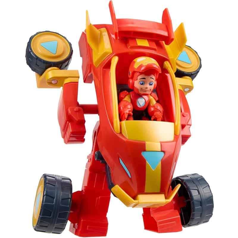 La figura articulada incluida de Iron Man cabe dentro del auto de juguete tanto en modo vehículo como en modo armadura, y puede permanecer en el interior durante la conversión.