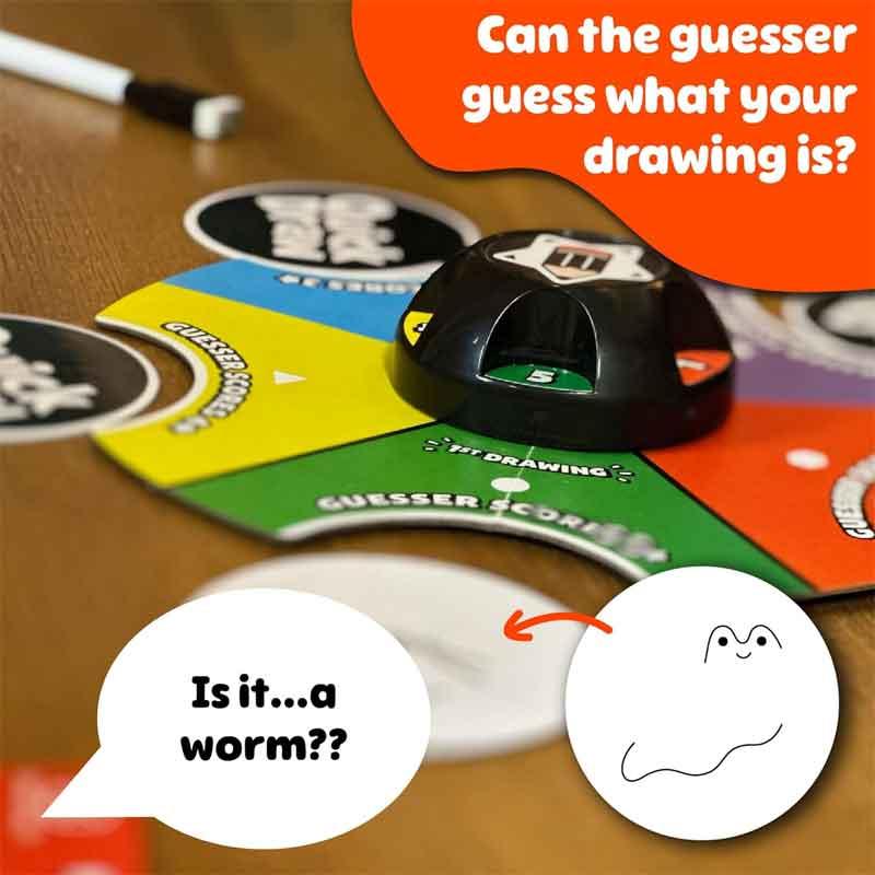 Incluye : 50 tarjetas con 500 indicaciones de dibujo, un tablero de juego con un centro de mesa giratorio, 5 blocs de dibujo de fácil limpieza, bolígrafos de borrado en seco y un conjunto de tonos elegantes para el adivinador.