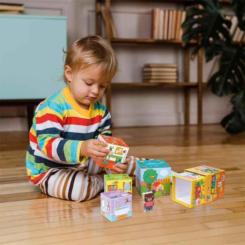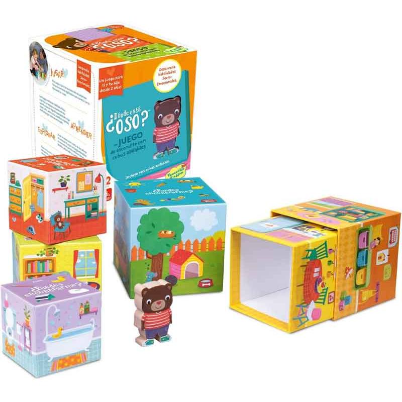 El juego incluye seis cubos apilables de material resistente y una figura de Oso de madera. La mecánica es sencilla y adaptable: se esconde la figura de Oso bajo uno de los cubos y el niño debe adivinar dónde se encuentra.