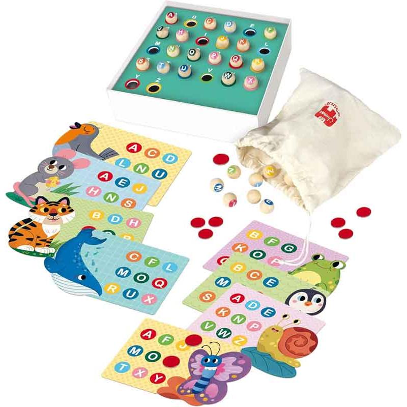 Contiene 8 cartas de doble cara, 26 bolas de madera con las letras del alfabeto, 1 cuadrícula de juego, 1 bolsa de tela, 100 fichas e instrucciones.