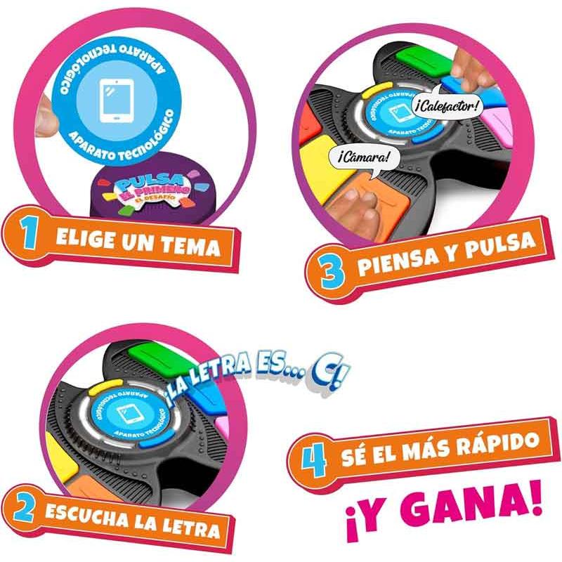 Pulsa el Primero El Desafío es un juego lleno de emoción en el que deberás pensar rápido, encontrar una palabra que encaje con el tema y la letra, y pulsar antes que nadie. ¡Diversión y risas aseguradas!