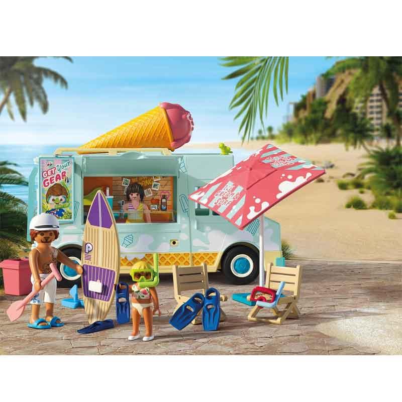 Contenido: Figuras: 1 mujer, 1 hombre con gorra, 1 niña; Animales: 1 pájaro; Accesorios: 1 camión con gran cono de helado en el techo, 1 mostrador de helados con helado de fresa, chocolate y vainilla, 1 vaso con tapa, 1 tubo, 1 vaso con pajita, 2 conos de helado con varias bolas de helado enchufables, 1 tabla de surf, 1 remo, 2 aletas, 2 gafas de buceo con tubo, 3 cajas de fruta, 1 sombrilla, 2 sillas plegables, 1 papelera, 1 velero de juguete, 1 dispensador de bolas de helado.