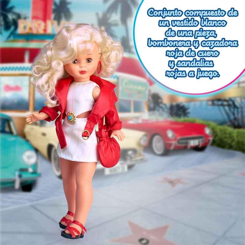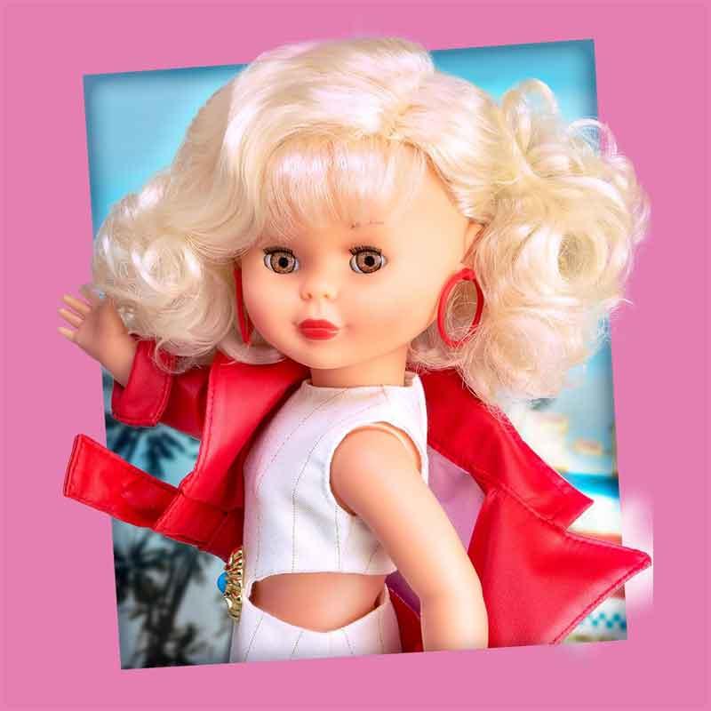 Esta reedición de Nancy nos trae de vuelta al modelo Nancy Tusset de 1975. Viene con un bonito look de la época: camisa de manga abullonada naranja y una falda larga con un bonito estampado que se completa con una gargantilla negra. Además lleva el pelo corto y rizado, lo que hace de este modelo algo aún más especial.