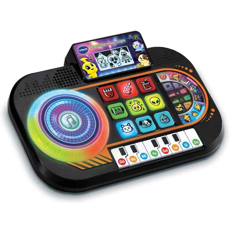 ¡Luces, ritmo y mucha creatividad! Con el disco scratch y el panel luminoso, los peques añaden efectos divertidos a cualquiera de las 9 canciones y 27 melodías incluidas, aprendiendo a mezclar como DJs de verdad.