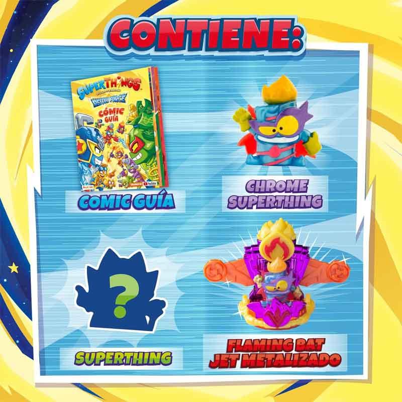 Cómic guía con 3 SuperThings (uno con efecto cristal) y 1 Kazoom Jet exclusivo con efecto metalizado.