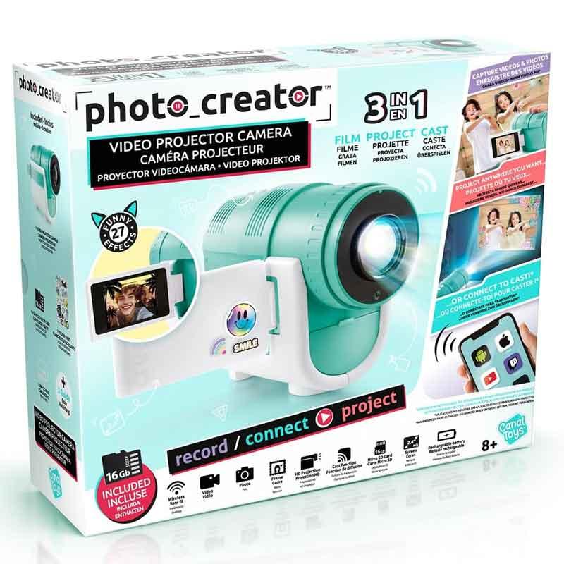 El Proyector Video Cámara Photo Creator es un dispositivo 3 en 1 que combina cámara de vídeo, proyector y conexión a dispositivos para que niñas y niños puedan grabar, proyectar y compartir sus creaciones de forma sencilla y divertida.
