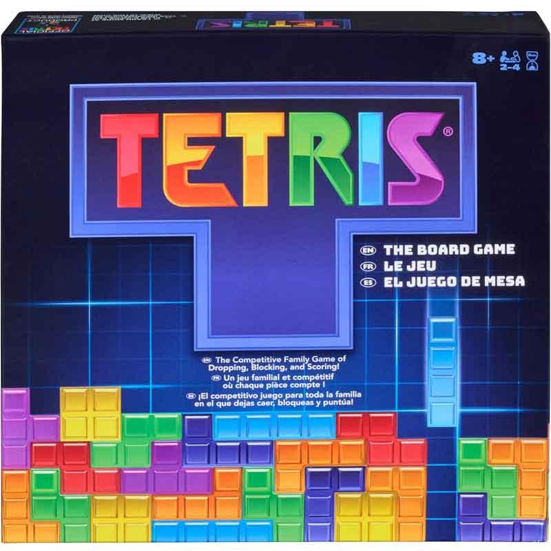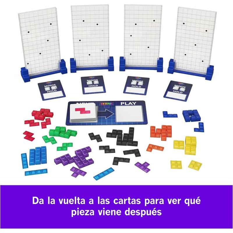 INCLUYE: 4 cuadrículas Tetris, 4 cartas de jugador, 1 tablero de juego, 28 cartas Tetris, 152 tetriminos, instrucciones.