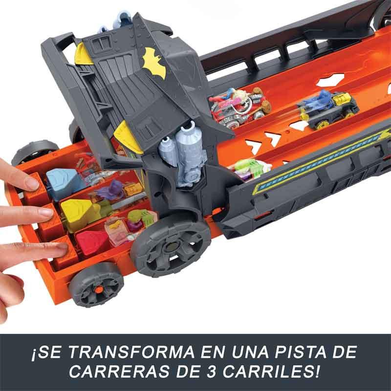 El vehículo a gran escala cuenta con gráficos de Batman y puede almacenar vehículos de RacerVerse de Hot Wheels en la parte inferior.