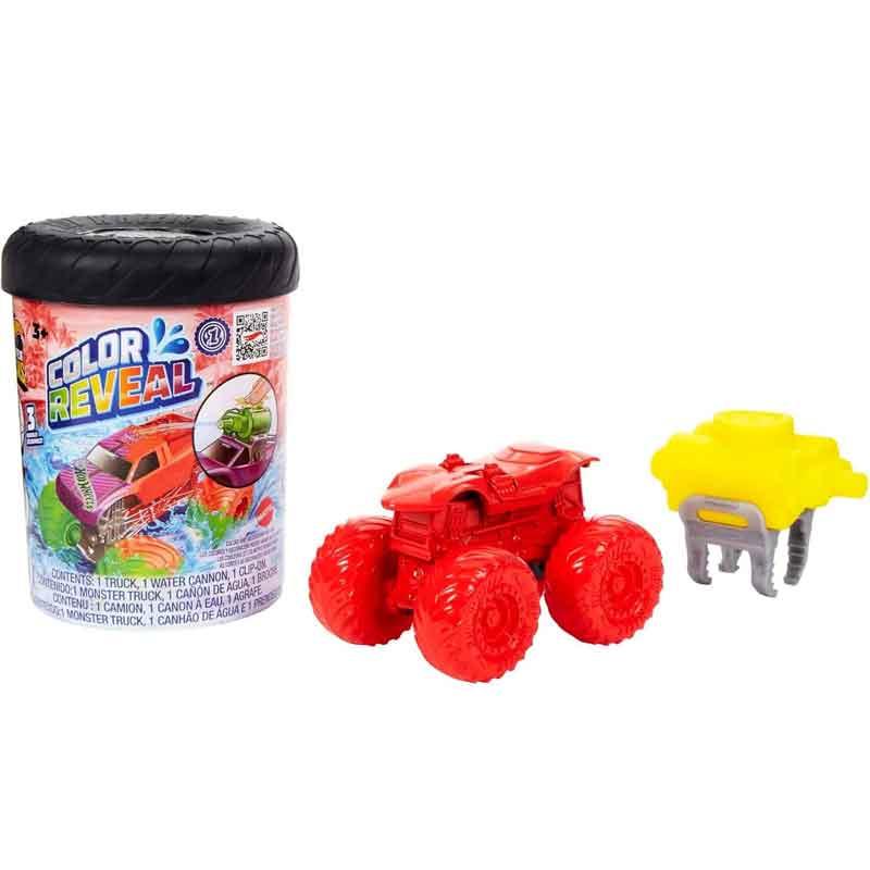 Incluye 1 Hot Wheels® Monster Trucks Color Reveal™, 1 tambor reutilizable, 1 tanque de agua y 1 broche para el tanque de agua.