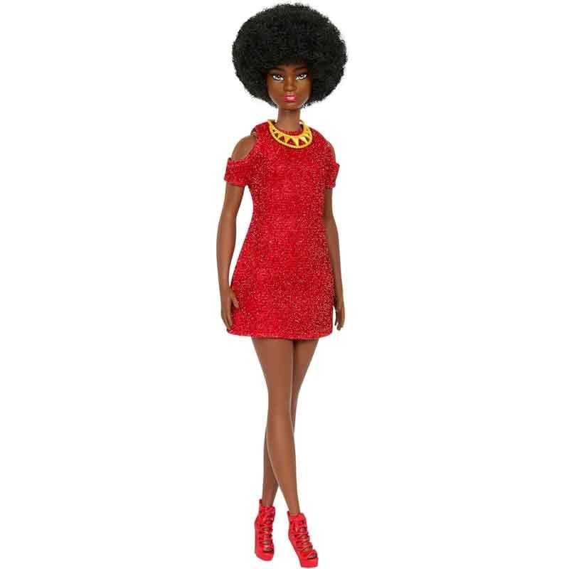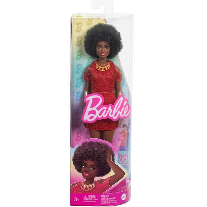 Barbie Fashionistas N.221, Muñeca con pelo negro rizado al natural,vestido rojo y collar dorado inspirado en el estilo de 1980