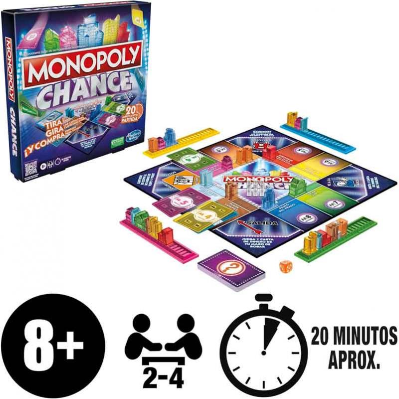 ¡Olvida todo lo que sabes del juego de mesa Monopoly! El juego Monopoly Chance es un juego de cartas cuyas partidas se juegan en 20 minutos aproximadamente.