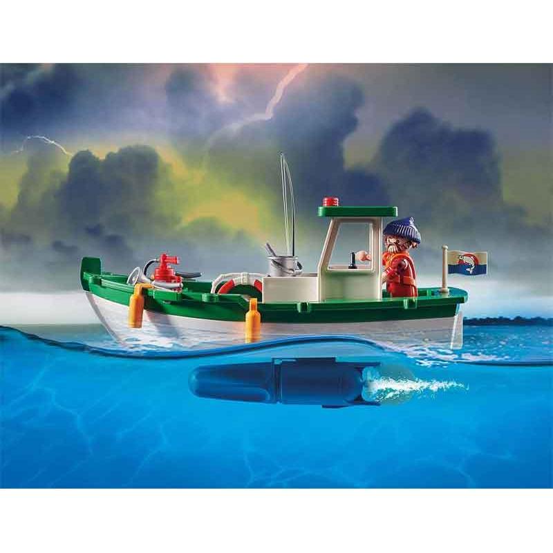 El set incluye tres figuras, helicóptero, equipo de rescate, barco pesquero flotante, equipo de pesca, llamas, peces y muchos otros accesorios.