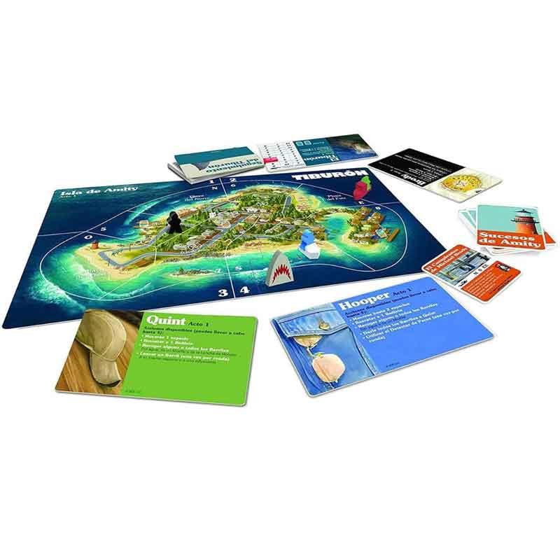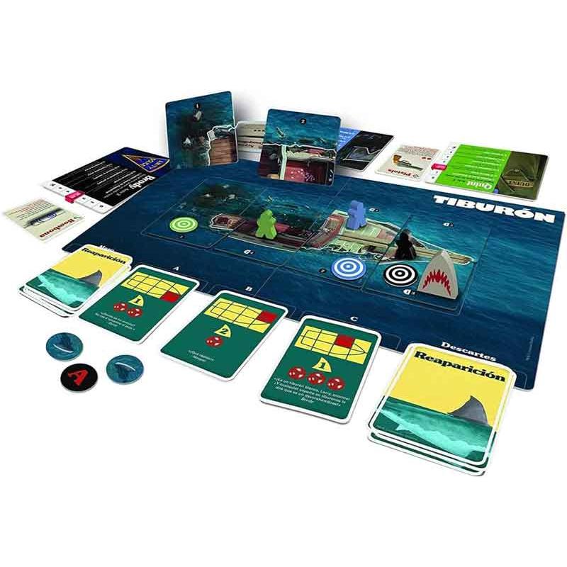 Contiene: 1 Tablero de doble cara, 1 Peón de Tiburón, 2 Peones de Barco, 3 Peones de Tripulación, 16 Cartas de Habilidad Depredadora, 16 Cartas de Reaparición, 22 Cartas de Equipamiento, 16 Cartas de Sucesos de Amity, 3 dados, 1 Bloc de Seguimiento del Tiburón.