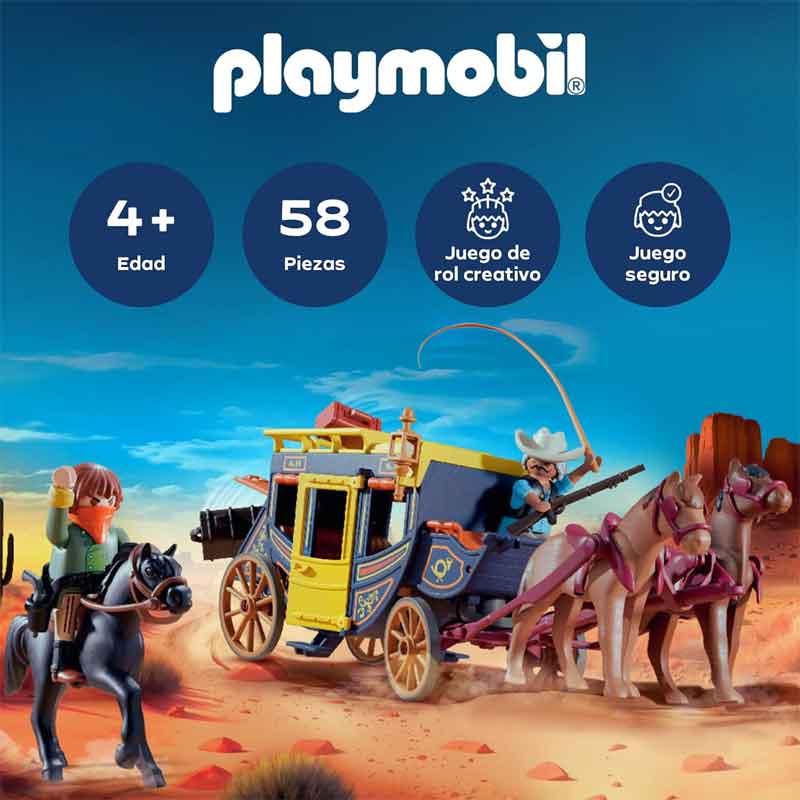 ¡La aventura aguarda en polvorientos senderos! La diligencia de PLAYMOBIL atraviesa el Salvaje Oeste con dos valientes figuras y tres robustos caballos.